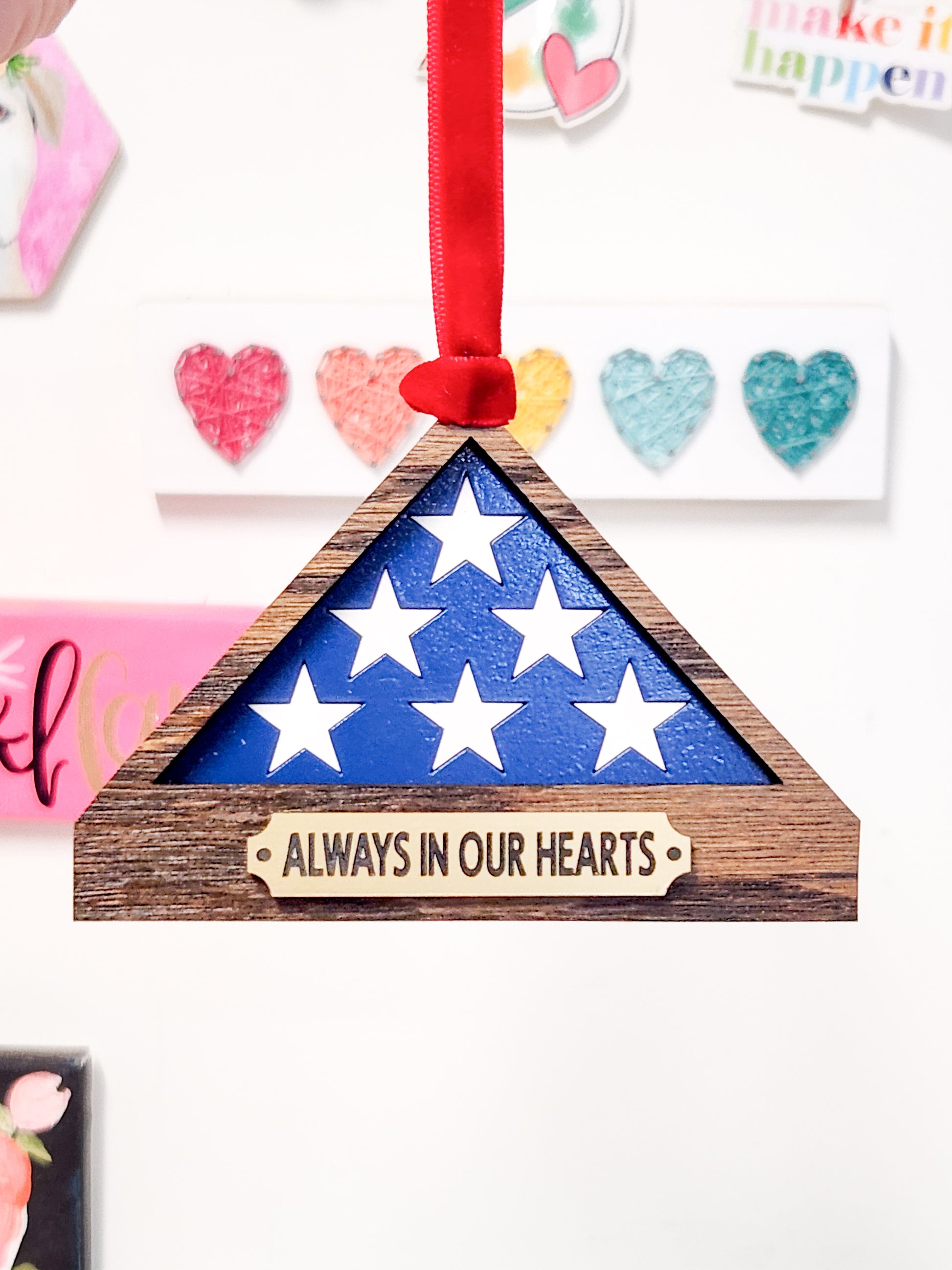 A meaningful way to honor the memory of a loved one. This handcrafted ornament features a folded American flag design and can be personalized.