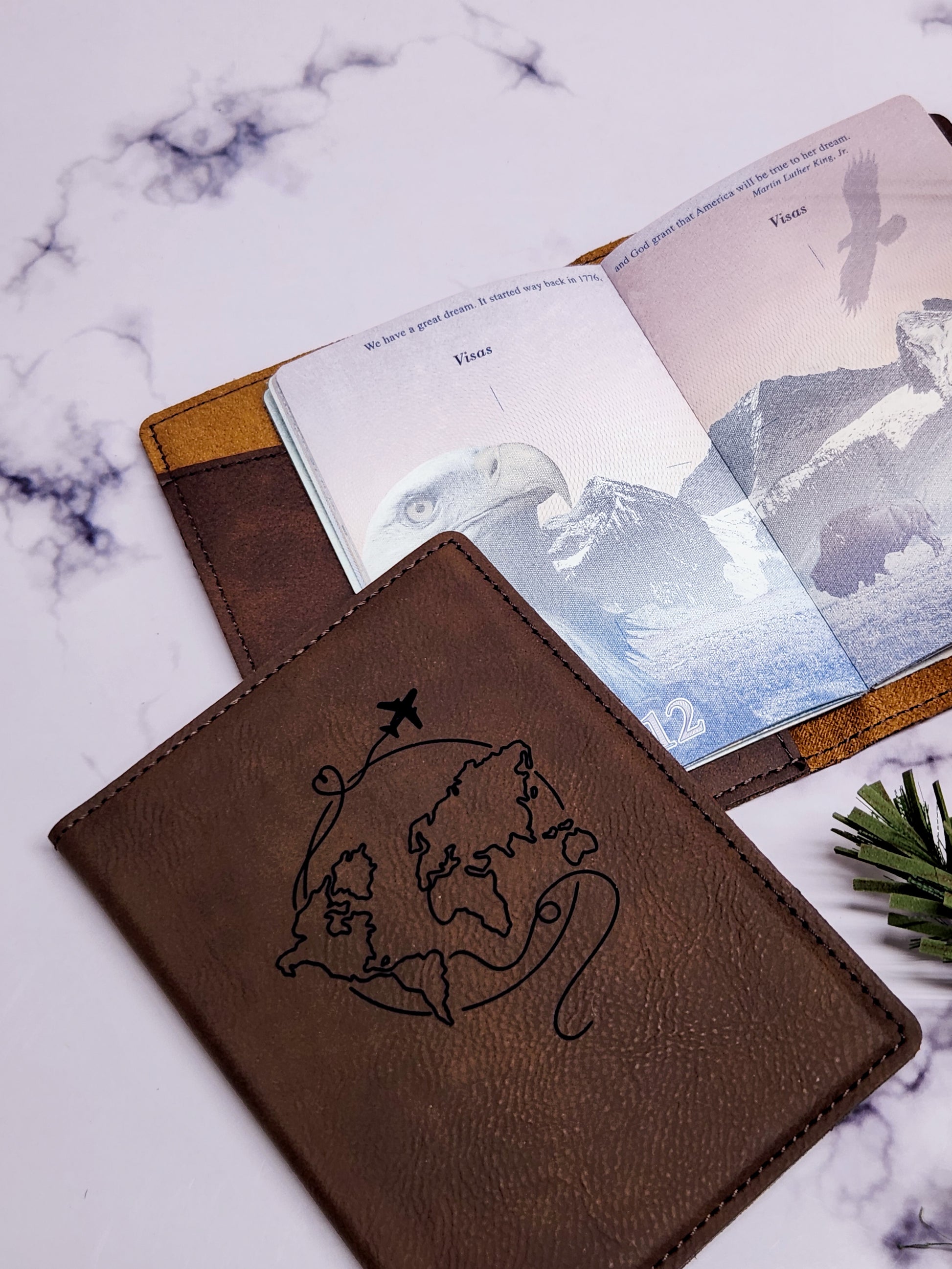 The includes one dark brown or aqua leatherette passport sleeve laser engraved for a clean, permanent finish. Choose from multiple engraving styles to make it uniquely theirs.